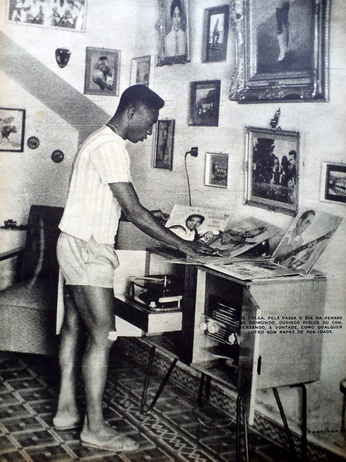 Nos momentos de folga, na sala da pensão, Pelé se distraia com um conjunto de som.