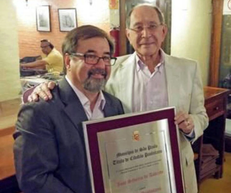 Milton Neves e José Silvério, uma parceria com mais de vinte anos, na entrega do título de cidadão para o jornalista de Muzambinho (MG). Foto: Jornal de Lavras