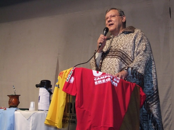 Lá, Milton fez palestra beneficente no ginásio da URI (Universidade Regional Integrada do Alto Uruguai e das Missões), recinto lotado de estudantes, professores e convidados.