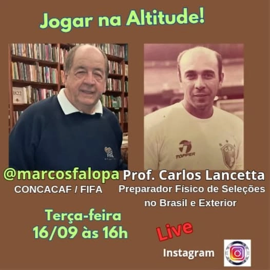 Carlos Alberto Lancetta, professor, técnico de atletismo e diretor de cursos de capacitação, é o convidado desta terça-feira (16), a partir das 16h, da live comandada por Marcos Falopa, coordenador técnico, profissional que acumula um currículo invejável como treinador de diversos clubes e seleções, incluindo trabalhos de instrutor pela Fifa.