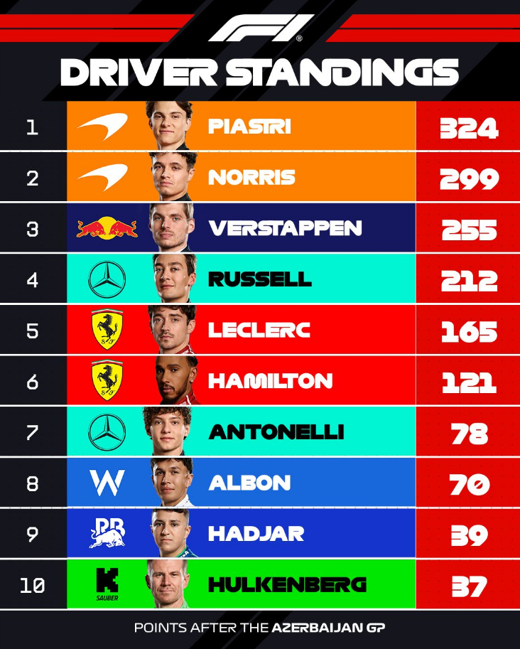 Oscar Piastri, que bateu na primeira volta em Baku no último domingo (21) segue líder, com 324 pontos. Norris, que poderia ter reduzido mais a diferença, teve um desempenho apagado e foi apenas o sétimo colocado, e está em segundo lugar na tabela, 25 pontos atrás.