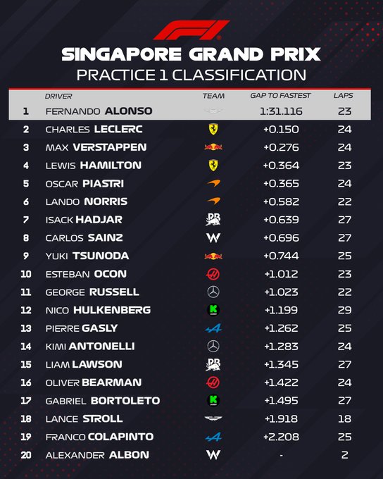 E justamente Alonso, bancando que completou 44 anos no último 29 de julho, bancando o "intrometido" em um campeonato cuja disputa está concentrada entre Piastri e Norris e, mais recentemente, com a ascensão de Verstappen, liderou a sessão, colocando a Aston Martin na ponta da tabela com a marca de 1min31s116, impondo 0s150 de margem para o segundo colocado, o monegasco Charles Leclerc (Ferrari).