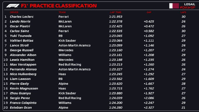 Com apenas uma hora de ensaio, o trabalho foi intenso, com trocas de compostos constantes para, apenas nos minutos derradeiros, o mais macio ser utilizado, exatamente quando Leclerc colocou seu nome no topo da tabela com a marca de 1min21s953 pelos 5.380 metros do traçado de Lusail.