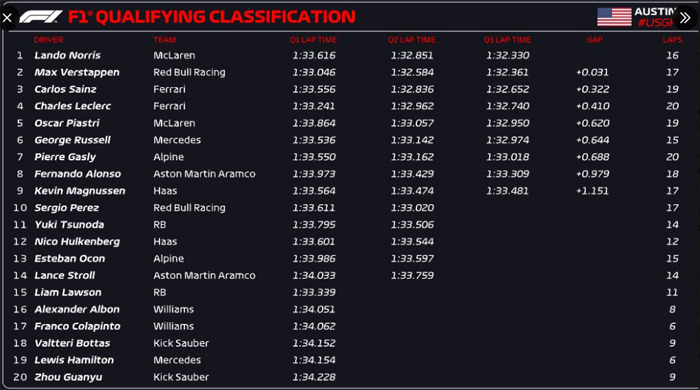 Parecia que os minutos finais seriam eletrizantes na disputa pela pole, entre Norris e Verstappen, mas Russell bateu e provocou a bandeira amarela, impedindo que os tempos fossem modficiados. Assim, Norris se assegurou com a pole.