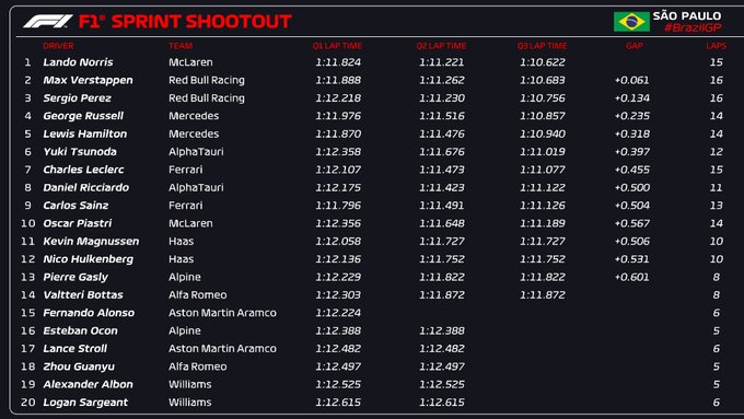 No chamado shootout, realizado com pista seca e tempo ensolarado no traçado paulistano de 4.309 metros, com temperatura ambiente na casa dos 25,5ºC e do asfalto em 51,8ºC, Norris anotou sua melhor passagem no Q3 em 1min10s622, 0s061 melhor que Verstappen, que estará ao seu lado na primeira fila.