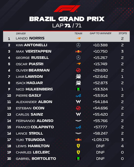 Com a vitória no GP de São Paulo, Lando Norris chegou aos 390 pontos, 24 à frente de Oscar Piastri o segundo do Mundial, que soma 366. Max Verstappen, o terceiro, está com 341, em terceiro.