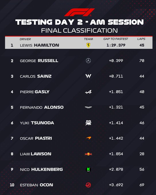 O tetracampeão Max Verstappen não treinou hoje. A Red Bull reservou o dia apenas para o neozelandês Liam Lawson na condução do RB21. Ele foi o sétimo mais veloz. Verstappen cumprirá os dois períodos do dia derradeiro de testes, amanhã.