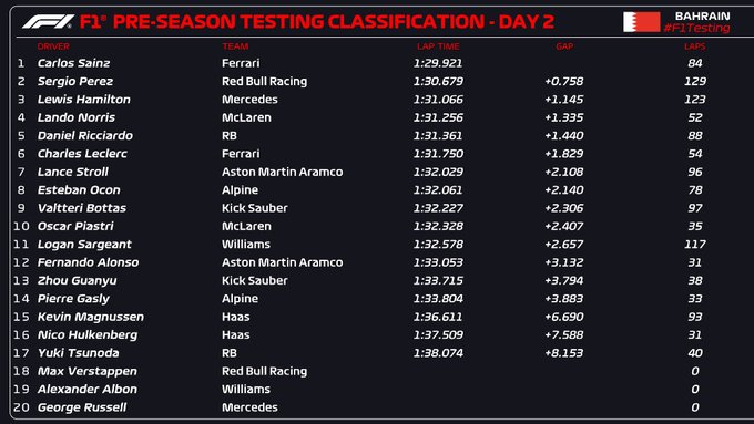 Nesta quinta-feira (23), desta feita com o espanhol Carlos Sainz Jr., que assumiu o comando da SF-24 no período vespertino em Sakhir, após a jornada do monegasco Charles Leclerc no turno da manhã, com o melhor tempo até agora no compilado de testes.
