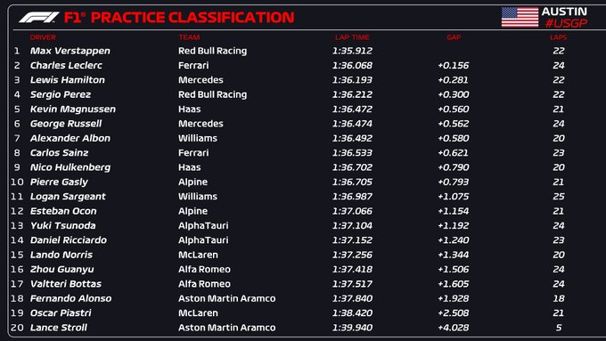 Em seu giro mais veloz pelos 5.513 metros do traçado texano, o tricampeão fez 1mi35s912, 0s156 mais rápido que a Ferrari de Charles Leclerc, segundo colocado.