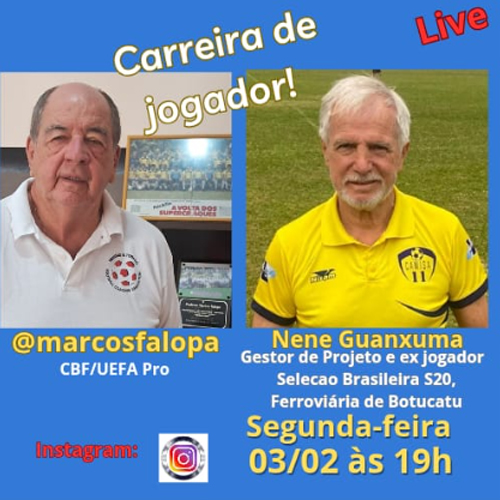 Ex-atacante do São José, do Botafogo de Ribeirão Preto e do Grêmio, entre outros, Nenê Guanxuma é o o convidado desta desta segunda-feira (3), às 19h00 da live comandada por Marcos Falopa, coordenador técnico, profissional que acumula um currículo invejável como treinador de diversos clubes e seleções, incluindo trabalhos de instrutor pela Fifa.