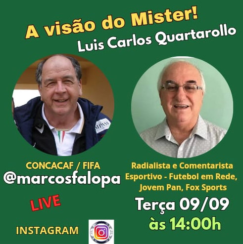 O jornalista Luís Carlos Quartarollo é o convidado desta terça-feira (9), a partir das 14h, da live comandada por Marcos Falopa, coordenador técnico, profissional que acumula um currículo invejável como treinador de diversos clubes e seleções, incluindo trabalhos de instrutor pela Fifa.