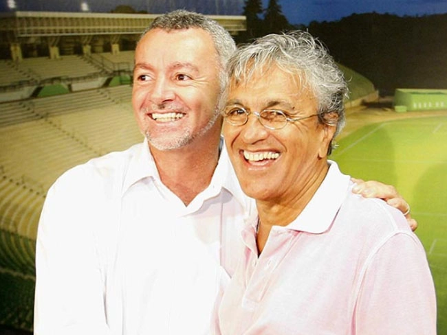 Bobô e Caetano Veloso no Estádio de Pituaçu em 11 de fevereiro de 2009, ocasião em que o Bahia derrotou o Poções por 2 a 0, confronto válido pelo Campeonato Baiano. Anos antes, Caetano incluiu Bobô em um dos versos de sua bela canção `Reconvexo´. Foto: Divulgação