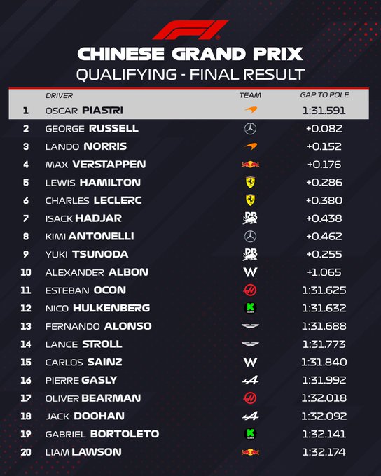 2. GP da China - Circuito Internacional de Xangai - 21 a 23/03/2025 - Vitória de Hamilton na Sprint - Pole de Piastri, com 1min31s591 -