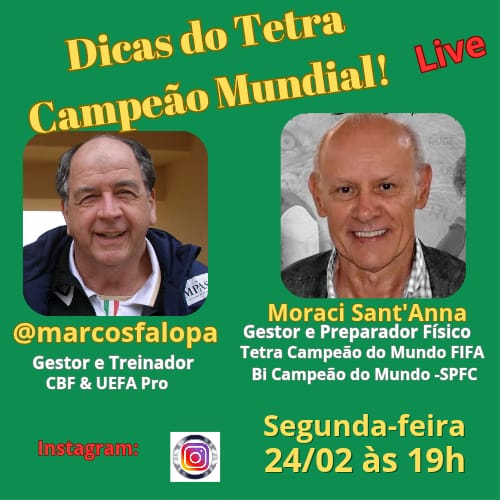 Moraci Sant´Anna, um dos principais preparadores físicos do futebol brasileiro, é o convidado desta segunda-feira (24), a partir das 19h, da live comandada por Marcos Falopa, coordenador técnico, profissional que acumula um currículo invejável como treinador de diversos clubes e seleções, incluindo trabalhos de instrutor pela Fifa.