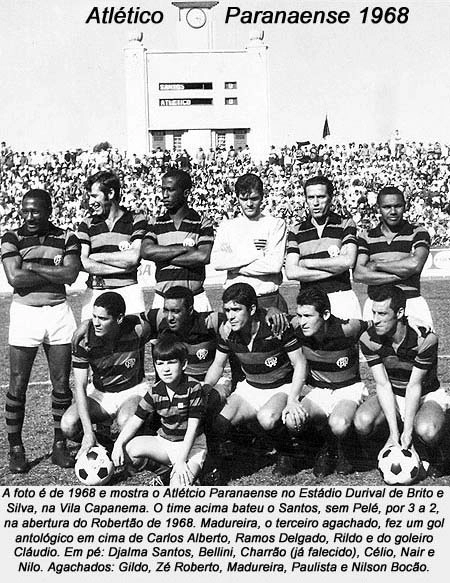 Atlético Paranaense durante a Taça de Prata de 1968 com Nilo, Zé Carlos, Célio, Bellini, Charrão e Nair em pé e Gildo, Zé Roberto, Madureira, Paulista e Nílson agachados