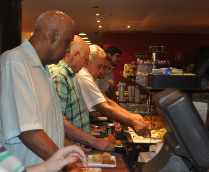 Pepe, Mengálvio e o saudoso Zito (1932-2015) se serviram no buffet e depois sentaram-se à mesa enquanto a sessão de autógrafos da obra literária acontecia.