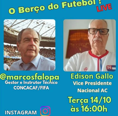 Atual vice-presidente do Nacional Atlético Clube, da capital paulista, Edison Gallo é o convidado desta terça (14), a partir das 16h, da live comandada por Marcos Falopa, coordenador técnico, profissional que acumula um currículo invejável como treinador de diversos clubes e seleções, incluindo trabalhos de instrutor pela Fifa.