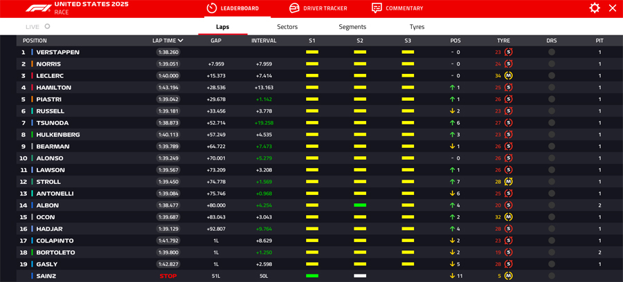 Um dia após vencer a Sprint, prova em que a dupla da McLaren passou em branco, Max começou na pole e se sustentou em primeiro na largada, enquanto Leclerc, de pneus macios, conseguiu superar Norris, o segundo colocado.