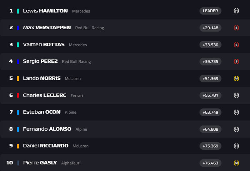 A Renault, a exemplo da boa jornada em Portugal, colocou seus dois carros na sequência, com Esteban Ocon em quarto e Fernando Alonso em quinto. Pierre Gasly (AlphaTauri) fechou a lista dos seis primeiros.